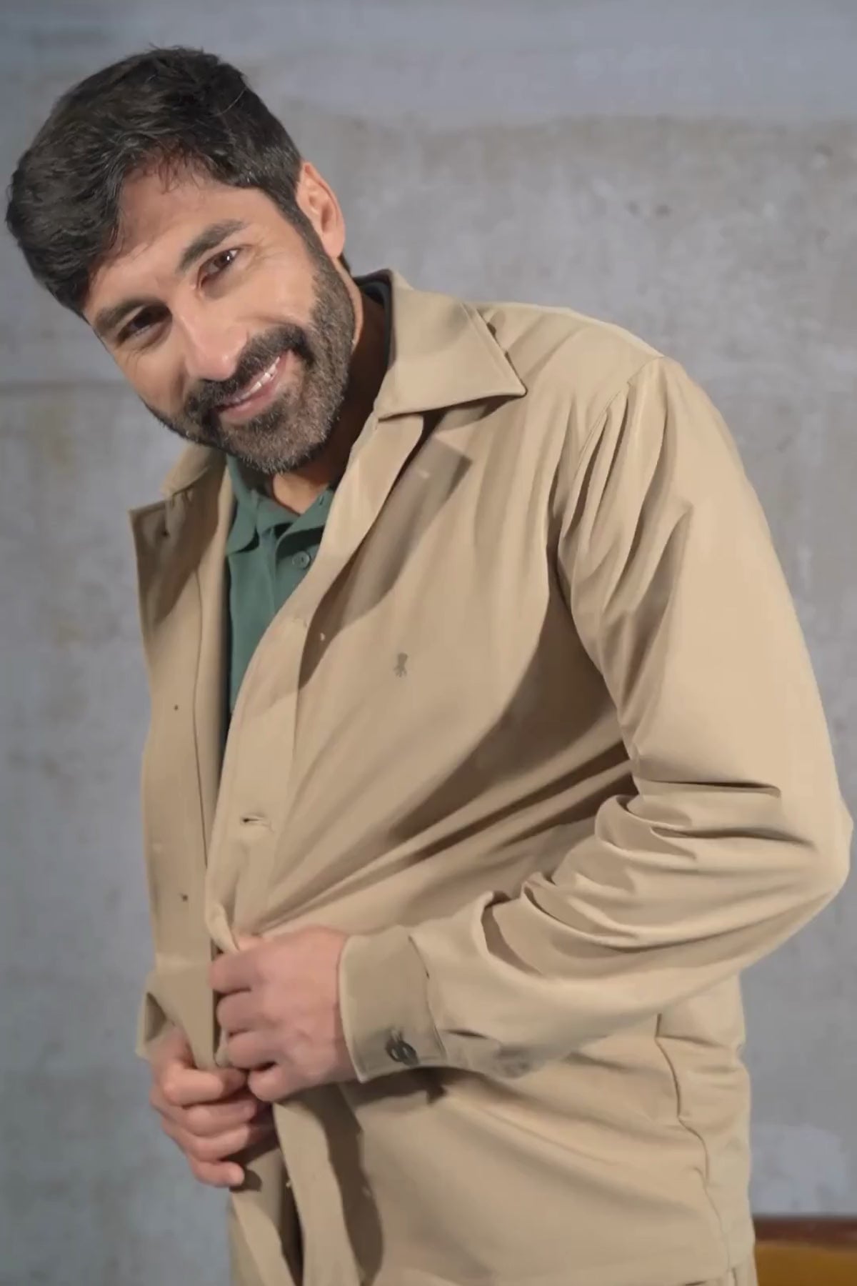 - Sobrecamisola técnica masculina ultraleve, na cor taupe.